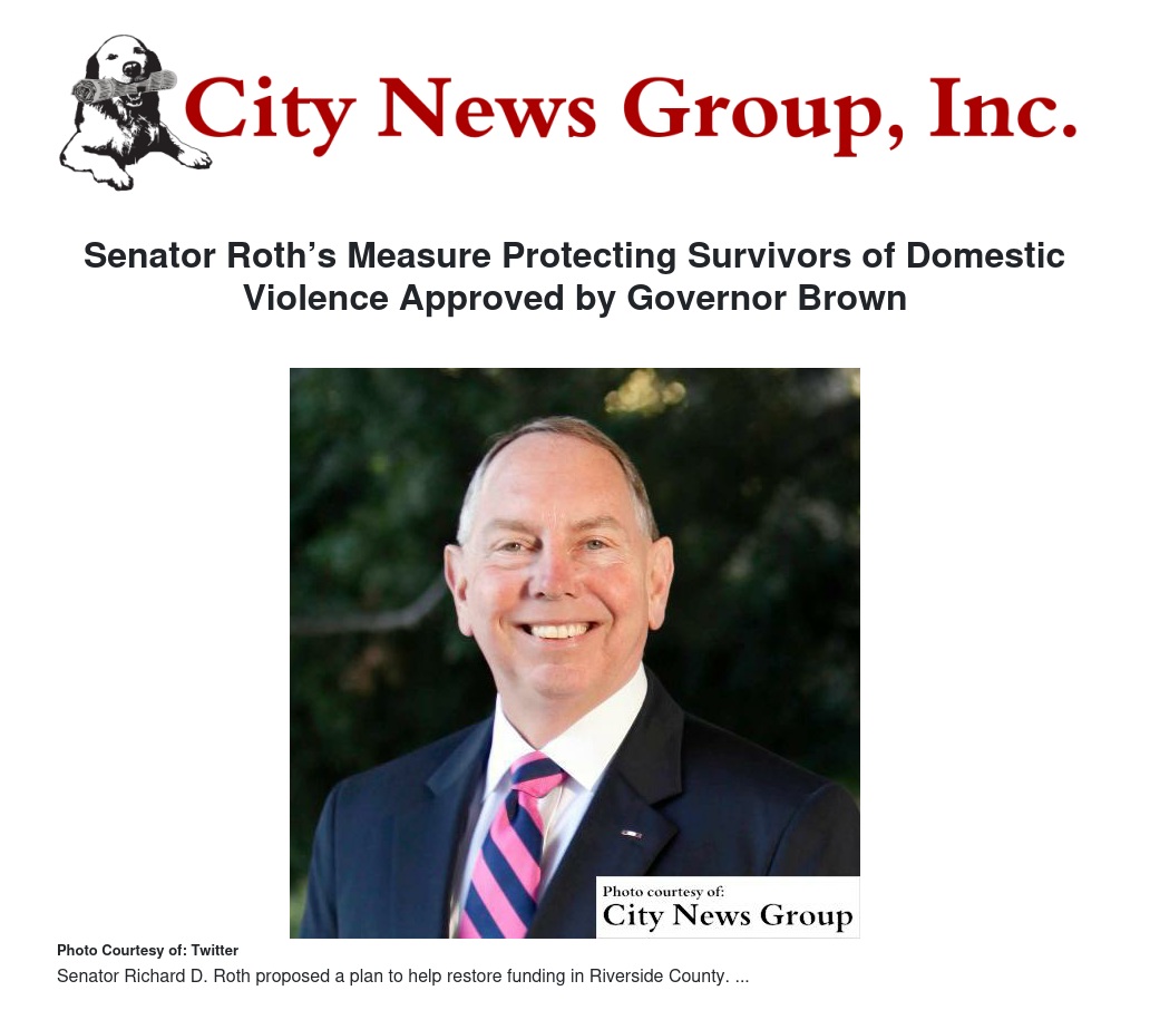 MORENO VALLEY>> Senator Richard D. Roth’s (D-Riverside) measure to protect survivors of domestic violence by holding offenders accountable has been signed into law by Governor Jerry Brown.
