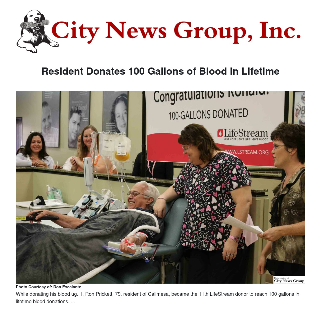 SAN BERNARDINO>> With his platelets donations, Ron Prickett, a 79-year-old resident of Calimesa, became the 11th LifeStream donor to reach 100 gallons in lifetime blood donations on Aug. 1.