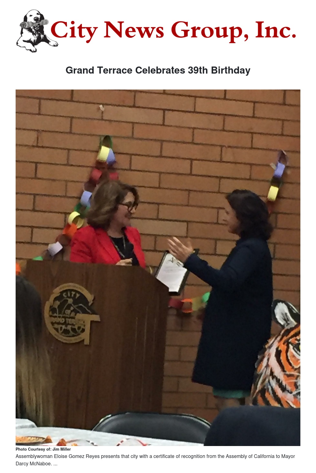 This past Wednesday evening, the City of Grand Terrace celebrated its 39th Birthday at City Hall in front of many dignitaries and residents. The Historical & Cultural Activities Committee, as always, arranged a superb pot-luck dinner and had a wide selection of goodies to feast upon. The Committee also selected Terrace Hills Middle School to be the special honoree for the evening. Mayor Darcy McNaboe was the emcee for the evening, and the first order of business was Assemblywoman Eloise Gomez Reyes, a 22 years resident in Grand Terrace, with husband Frank, presenting the City a certificate of recognition from the Assembly of California for its 39th Birthday. Thereafter, Councilman Doug Wilson gave the prayer for the evening meal and program.