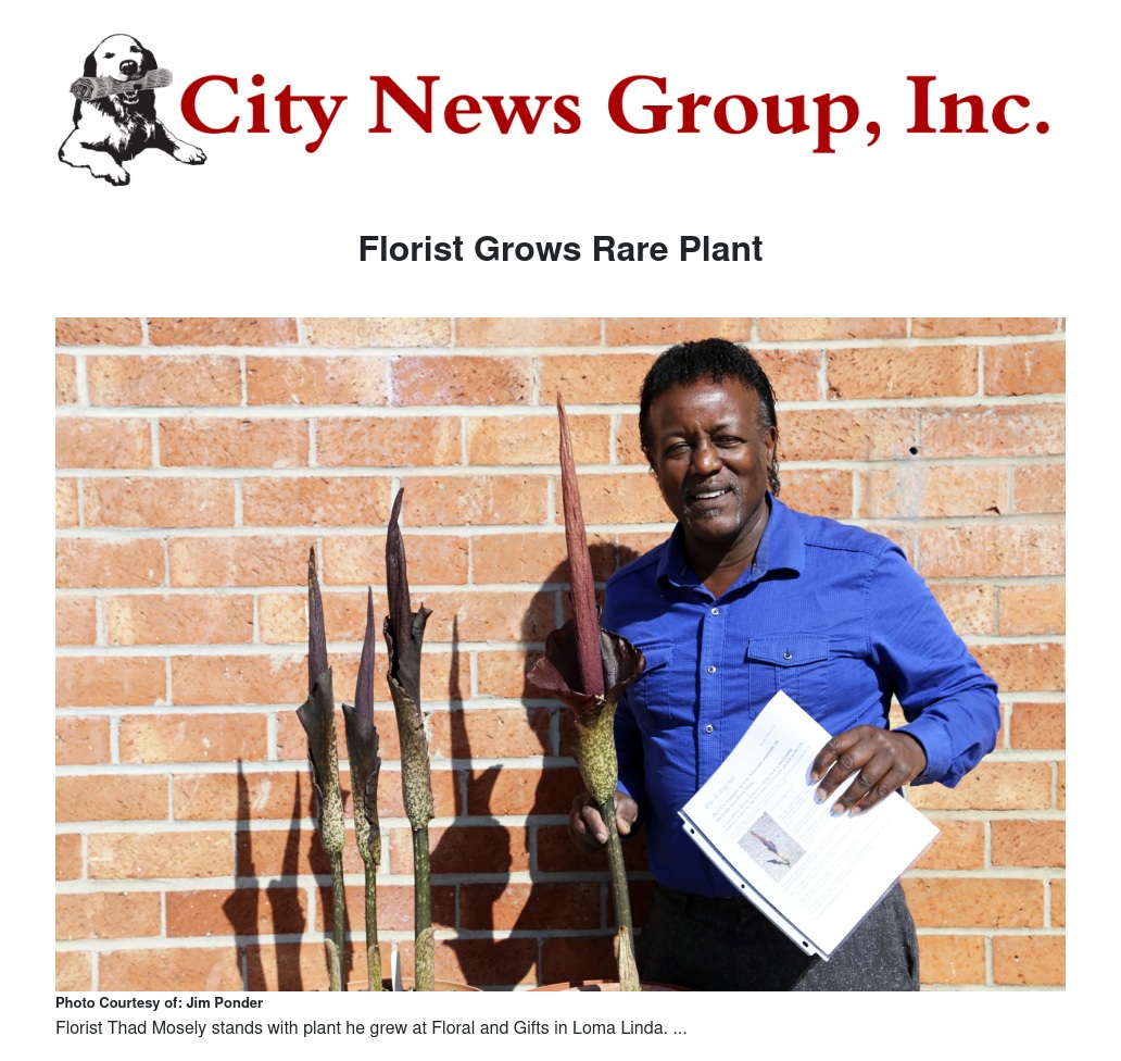 By getting Amorphophallus konjac to bloom, Thad Mosely, owner of Premier Floral and Gifts in Loma Linda, believes he bested a British public garden, which bragged last week about bringing a single 23.6-inch blossom to maturity outdoors. Mosely's bloom outdid the British specimen by a little over 13 inches measuring 37-inches in height.
