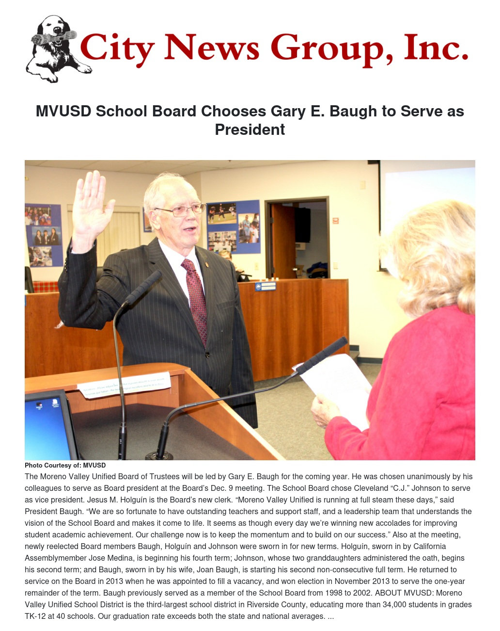 Also at the meeting, newly re-elected Board members Baugh, Holguín and Johnson were sworn in for new terms. Holguín, sworn in by California Assemblymember Jose Medina, is beginning his fourth term; Johnson, whose two granddaughters administered the oath, begins his second term; and Baugh, sworn in by his wife, Joan Baugh, is starting his second non-consecutive full term. He returned to service on the Board in 2013 when he was appointed to fill a vacancy, and won election in November 2013 to serve the one-year remainder of the term. Baugh previously served as a member of the School Board from 1998 to 2002.