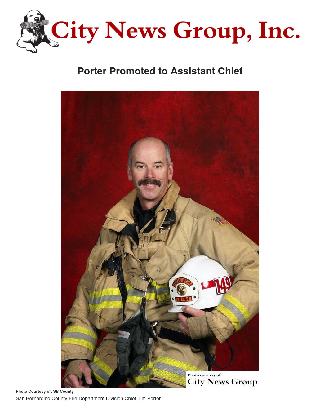 SAN BERNARDINO>> San Bernardino County Fire Chief Mark Hartwig recently announced the promotion of Division Chief Tim Porter to Assistant Chief, assigned to Division 11. His new duties will include training, safety and special operations.