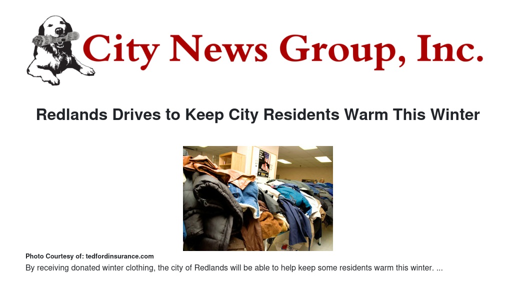 Residents can join the City of Redlands and the Redlands Service Club Council and help keep someone warm this winter.