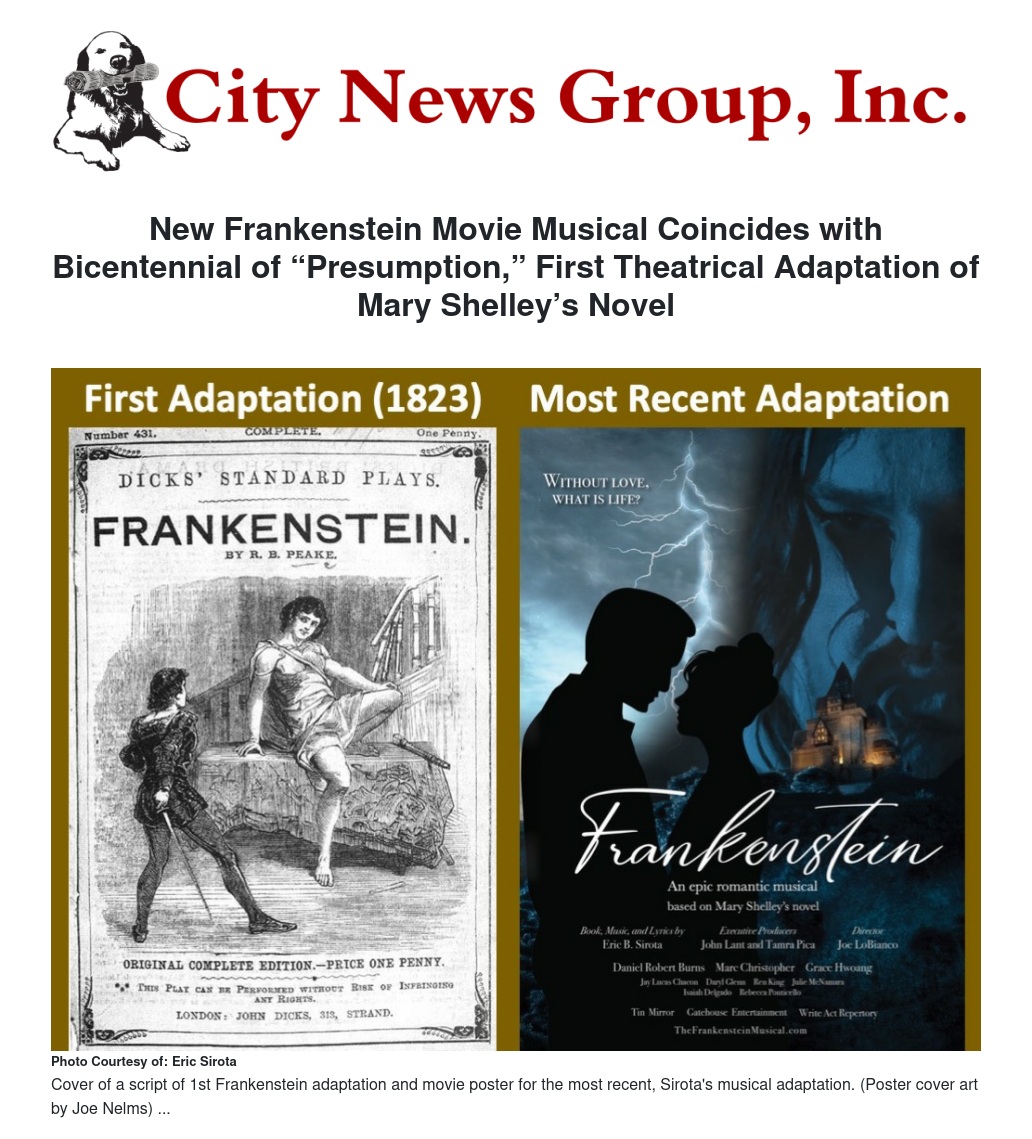This month marks the bicentennial of the first theatrical adaptation of Mary Shelley‘s Frankenstein, “Presumption; or, the Fate of Frankenstein” by Richard Brinsley Peake, which premiered on July 28, 1823. This coincides with the release of the most recent adaptation, the Joe LoBianco film, FRANKENSTEIN, Eric B. Sirota’s musical theater work which ran Off-Broadway on-stage for three years prior to the pandemic. It opened in 2017 around the time of the bicentennial of Mary Shelley’s novel, which was written in 1816 and published in 1818.