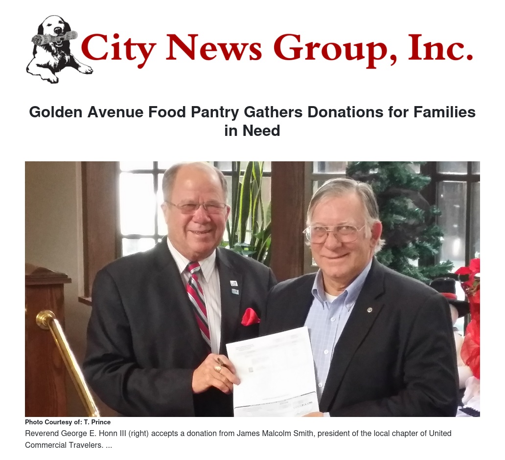Reverend George E. Honn III accepted a donation from James Malcolm Smith, president of the local chapter of United Commercial Travelers. Honn told Smith, "It is through donations such as yours that our work may continue."