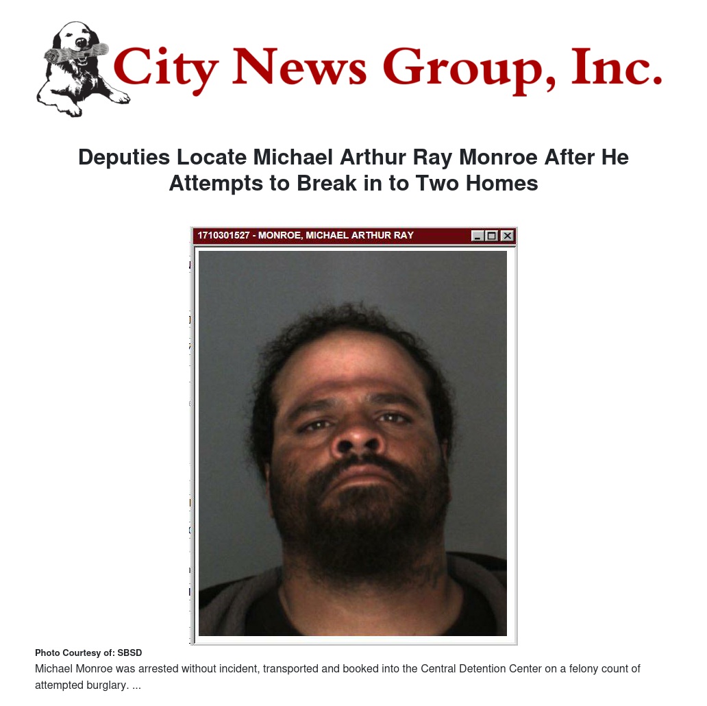 An initial check of the area for the suspect was unsuccessful. Additional investigation was conducted as was an active search by Loma Linda Deputies during the rest of their shift. At approximately 5:00 pm, Deputy Ortiz located the suspect in the area of Mt. View Avenue and Van Leuven St. The suspect was wearing the same clothing that he had been photographed wearing. Michael Monroe was arrested without incident, transported and booked into the Central Detention Center on a felony count of attempted burglary.