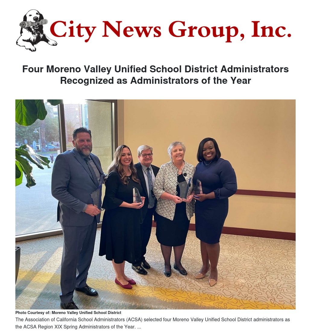 Four Moreno Valley Unified School District Administrators Recognized as Administrators of the Year by Luke Page - City News Group, Inc.
