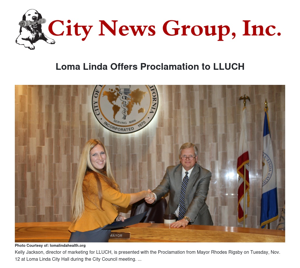 The City of Loma Linda honored Loma Linda University Children’s Hospital with a proclamation celebrating its 20th anniversary on the evening of Tuesday, Nov. 12 during the City Council meeting. Mayor Rhodes Rigsby presented the proclamation to Kelly Jackson, Director of Marketing for LLUCH, who accepted the recognition on behalf of the hospital.