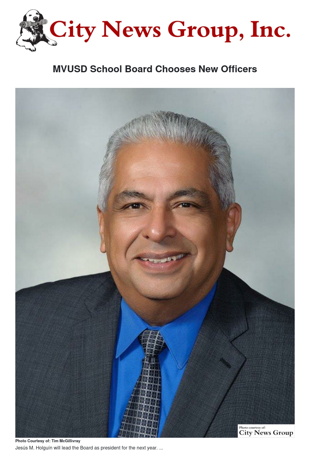 At its annual reorganization meeting, Tuesday, Dec. 8, the Moreno Valley Unified School District chose Jesús M. Holguín to serve as its president for the next 12 months. He assumed the presidency immediately.