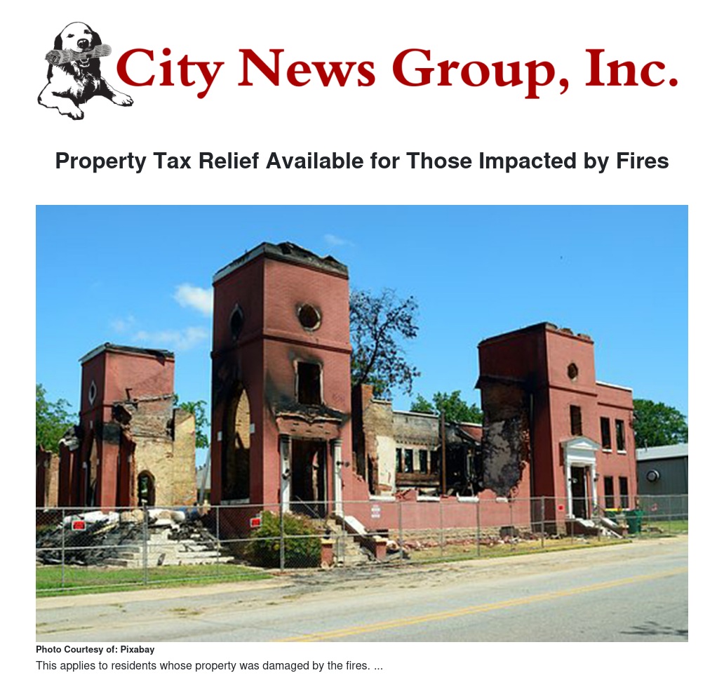 If your property has been damaged by the recent fires, you may be eligible for property tax relief. In many cases, the damaged property can be reappraised in its current condition, with some taxes refunded to the property owner. Once rebuilt, the property's pre damaged value will be restored.
