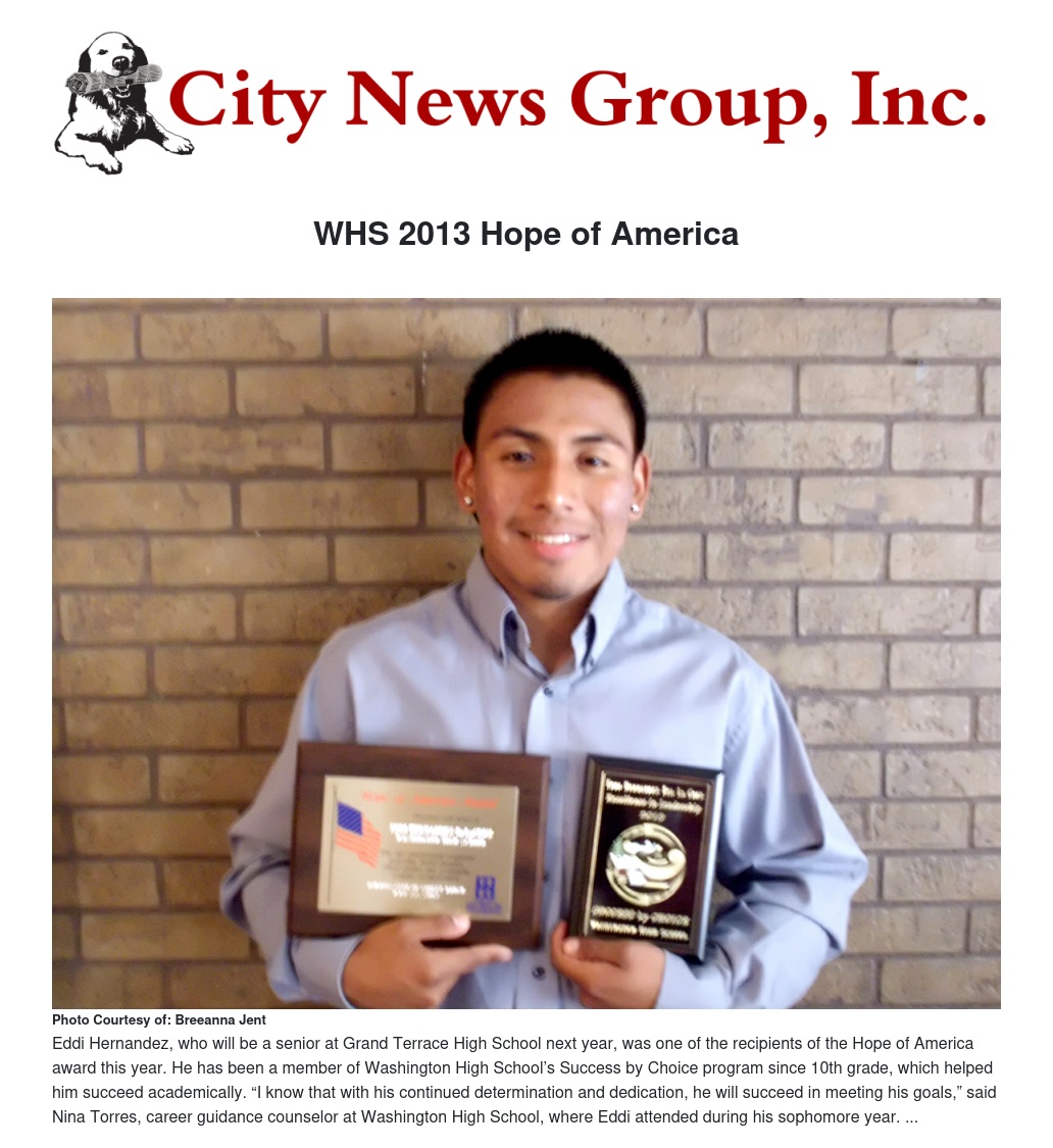Washington High School’s Success by Choice program celebrated the recognition of two students who were recognized on May 22 by the Kiwanis International as they were chosen recipients of the Hope of America Award 2013.
