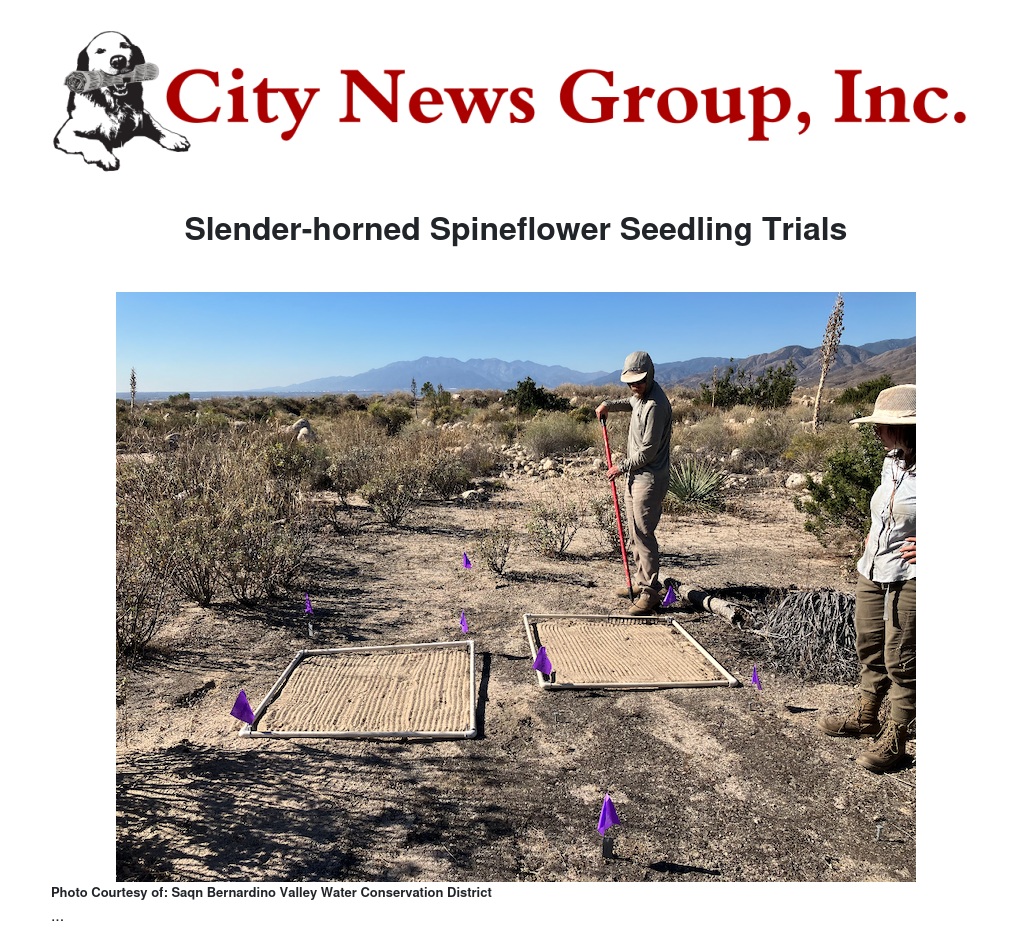 The District's field staff and environmental consulting team from Dudek spread more than 100,000 seeds of endangered slender-horned spineflower (Dodecahema leptoceras) into areas of the Upper Santa Ana River Wash preserve where the plant does not currently grow. A total of 260,000 seeds were initially collected from 418 plants through a seed-bulking process. The project's aim is to lay a foundation for successful introduction of the species so it can establish new populations. Each seeding area contains individual locations, or trial blocks, which are made up of various study plots. Seeding occurred within trial areas of Plunge Creek and Cone Camp and may be expanded to additional seeding locations meeting the goals of the Santa Ana Wash Plan.
