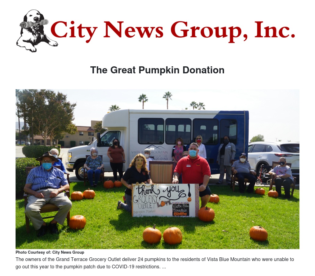 Not letting anything keep in their way of obtaining a staple fall tradition at the facility, Vista Blue Mountain reached out to local stores for help. Answering the call was the neighboring Grand Terrace Grocery Outlet.