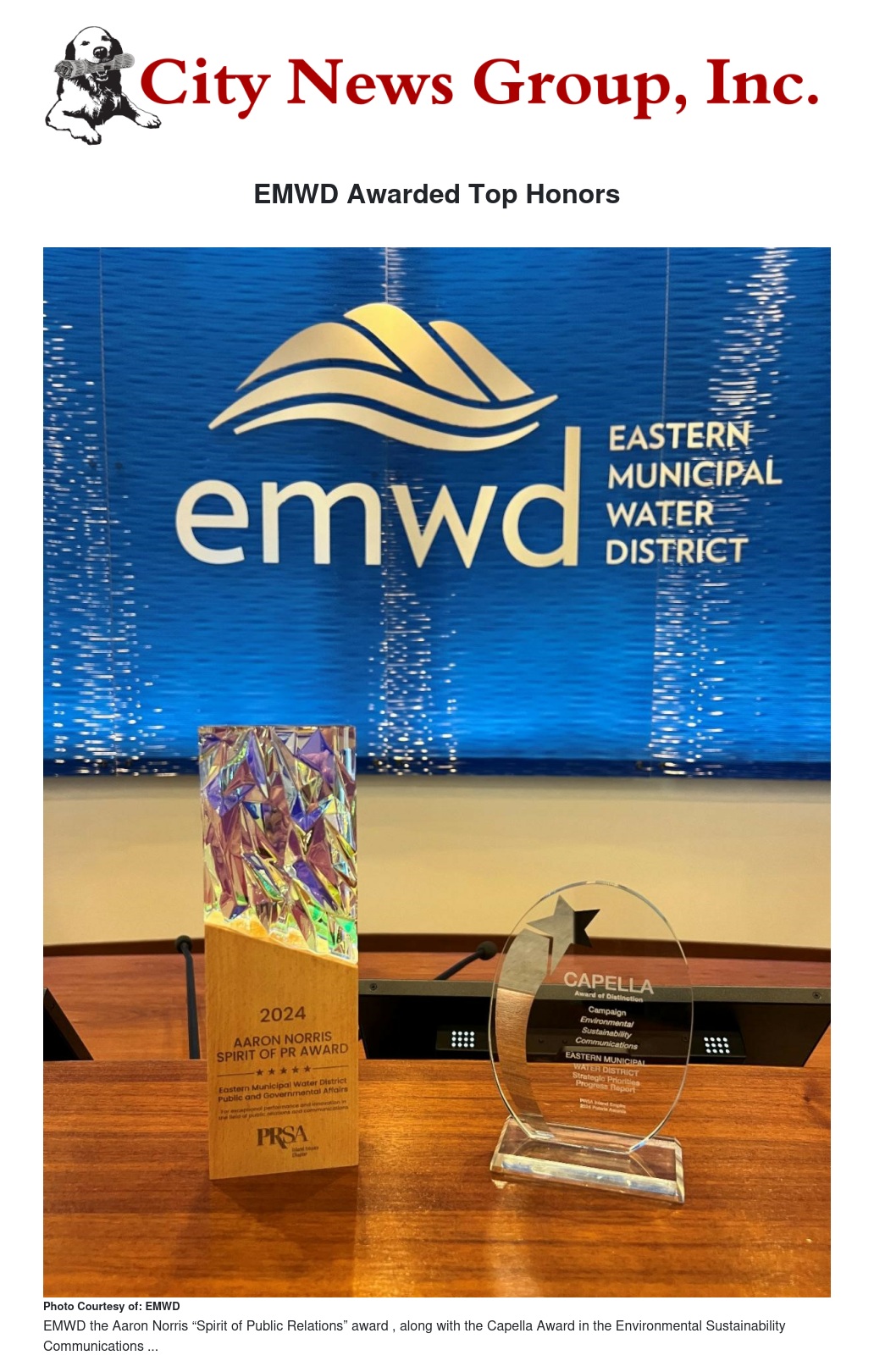 EMWD Awarded Top Honors by Ruby Stephenson - City News Group, Inc.