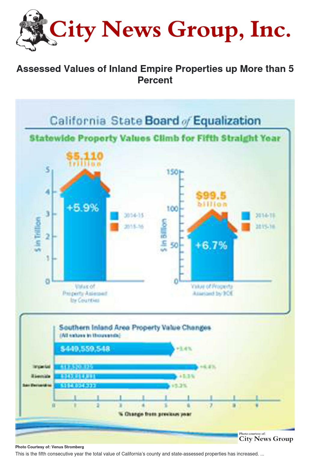 California State Board of Equalization (BOE) Member Diane L. Harkey, Vice Chair George Runner, and Chairman Jerome E. Horton announced that assessed values of properties in Imperial, Riverside, and San Bernardino counties rose 5.4 percent in 2015-16 ($449.6 billion) over 2014-15 values ($426.5 billion). County-assessed properties posted 5.5 percent year-over-year gains, while those assessed by the state rose 2.1 percent. Assessed values are 1.8 percent higher in this region than in 2008-09, when assessed values statewide hit their prior peak.