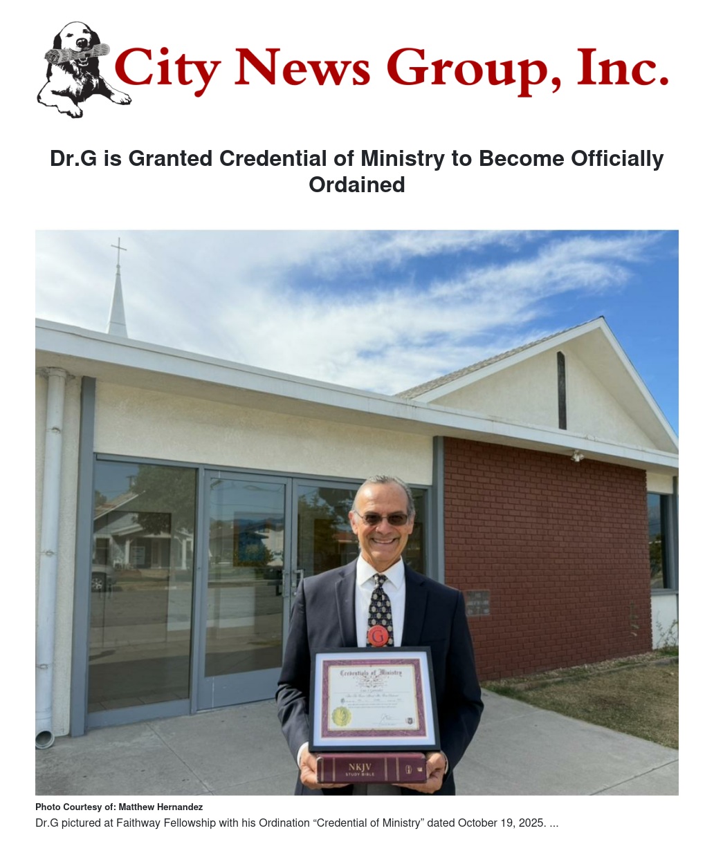 For several weeks, Dr.G has been in communication with the Universal Life Church, who after verifying his education, preaching experience, teaching experience and tenants of faith, granted him a “Credential of Ministry” to officially being Ordained as of August 19, 2025. Now, in addition to his preaching and teaching, he is authorized to perform weddings, funerals, and baptisms not only locally but throughout California, and in any state recognizing his authorization.