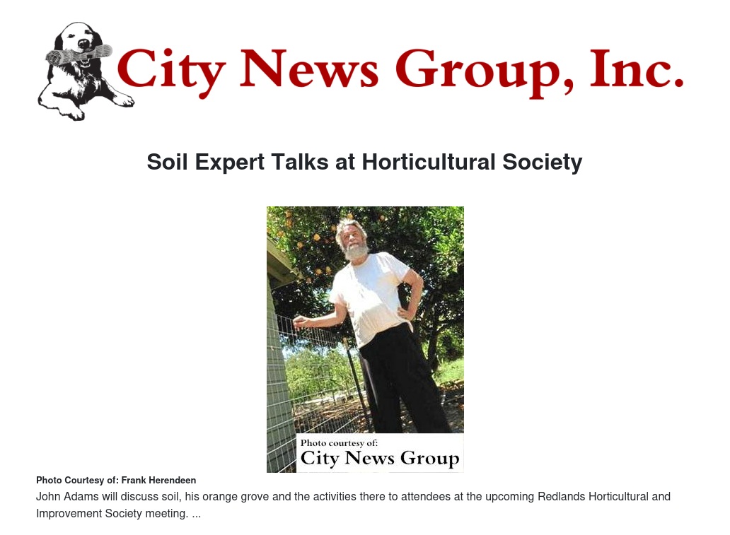 The public is invited to hear soil expert John Adams’s presentation of the “Last Orange Grove of Rialto,” the topic for the Redlands Horticultural and Improvement Society’s general meeting at the Church of the Nazarene on Thursday, Feb. 19 at 7 p.m.