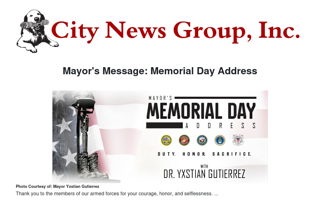 Mayor's Message: Memorial Day Address by Mayor Yxstian Gutierrez - City News Group, Inc.