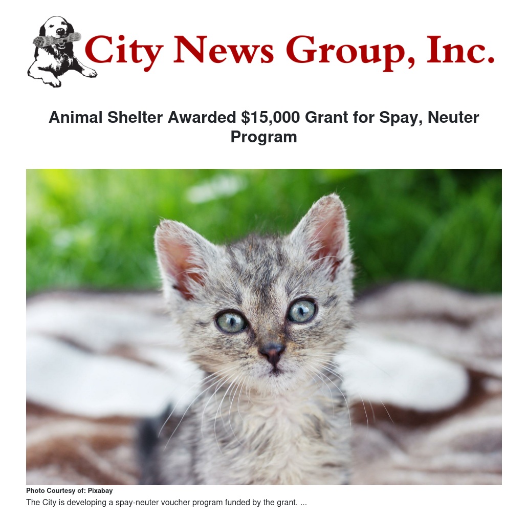 Grant funds can be used only to spay and neuter dogs and cats owned by residents, and cannot be used for animals impounded at the Animal Shelter. The City is developing a spay-neuter voucher program funded by the grant.