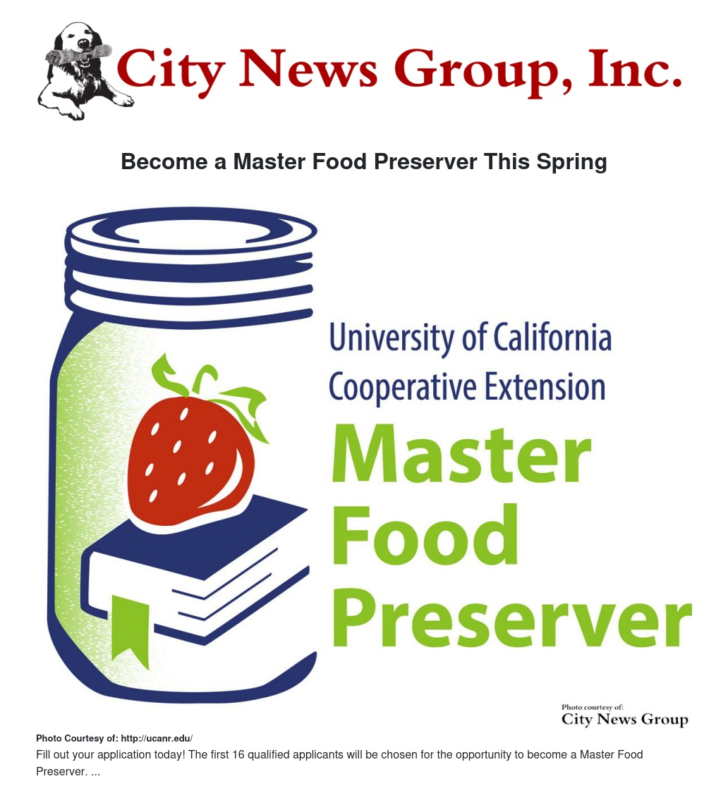 The opportunity to become a Master Food Preserver is here. The UCCE San Bernardino County Master Food Preserver (MFP) program is offering a spring class to the public that will run from Jan. 25, 2016 until April 18, 2016.