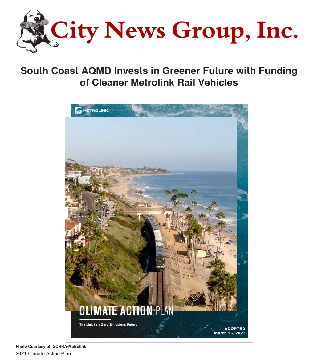 The South Coast Air Quality Management District (South Coast AQMD) Governing Board recently unanimously approved up to $59.3 million in funding through the Carl Moyer Program for Metrolink to purchase two cutting-edge, zero-emission rail vehicles. The Board also approved up to $87.4 million from South Coast AQMD’s contingency grant award list to replace 12 earlier-generation Metrolink locomotives with lower-emission Tier 4 locomotives. These awards will advance Metrolink’s ambitious emission-reduction goals outlined in the organization’s 2021 Climate Action Plan.