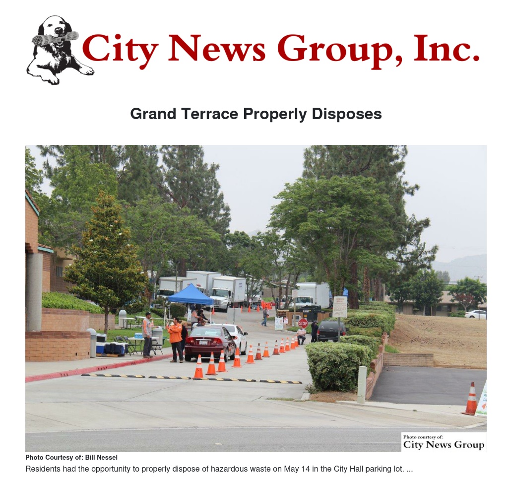 Grand Terrace held a Hazardous Waste Collection Event on May 14 at the Grand Terrace City Hall to help residents practice safer, more environmentally conscious ways to recycle and dispose of dangerous waste.