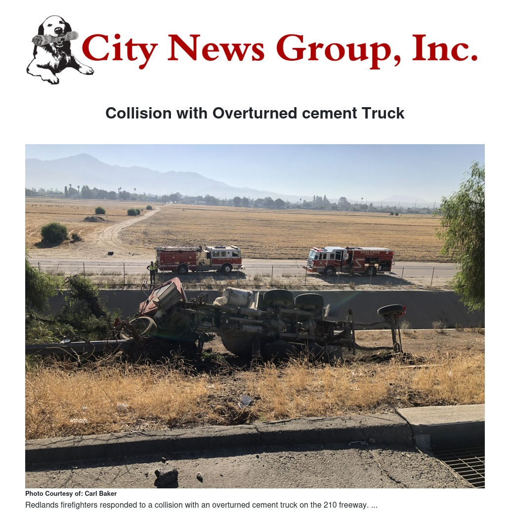 The Redlands Fire Department responded to a traffic collision involving an overturned cement truck on the westbound 210 freeway between Interstate 10 and the San Bernardino Avenue off-ramp Saturday morning, Aug. 7. One person suffered minor injuries, and the collision caused a fuel spill on the freeway embankment.