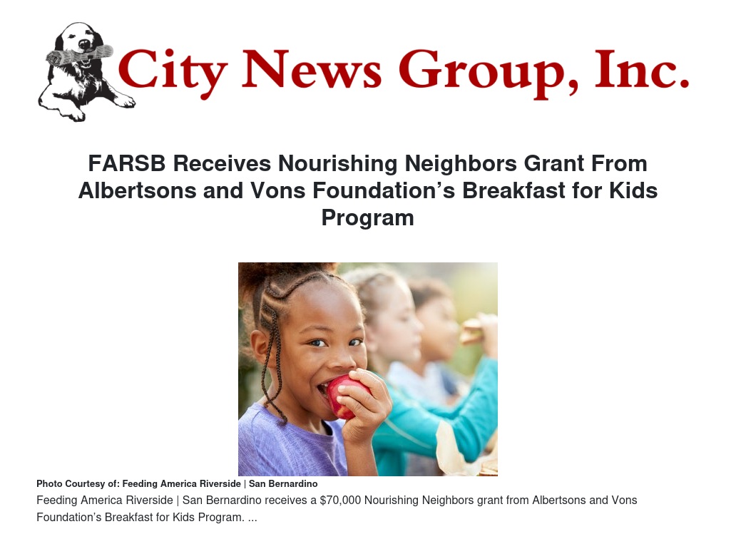 Feeding America Riverside | San Bernardino (FARSB) received a $70,000 grant from the Albertsons and Vons Foundation’s Nourishing Neighbors Program. The grant was provided by the Albertsons Vons Foundation and will be used to provide the summer meals project, which aims to provide breakfast items and other non-perishable food for children to eat when the school district is closed for summer vacation.