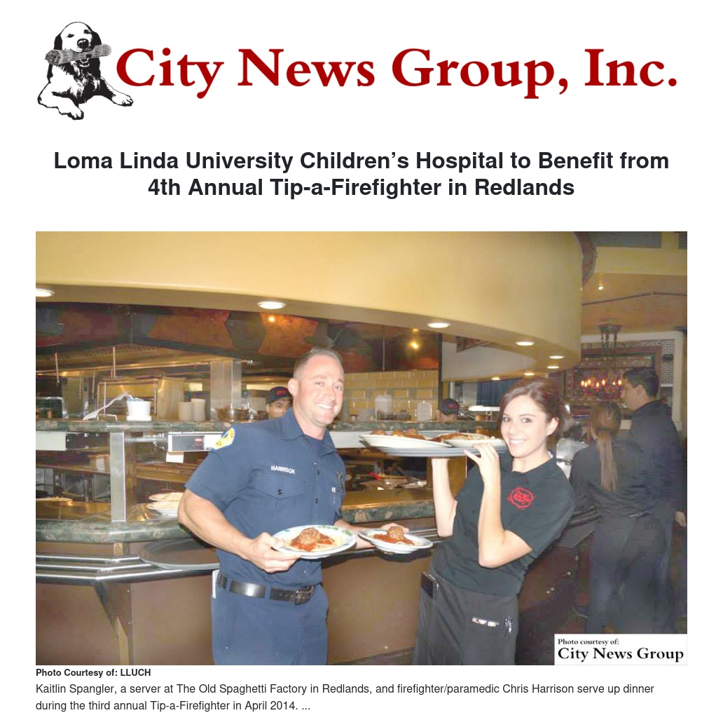 The Old Spaghetti Factory (OSF) in Redlands is hosting the 4th annual Tip-a-Firefighter benefiting Loma Linda University Children’s Hospital (LLUCH) on Tuesday, April 28 during lunch and dinner.