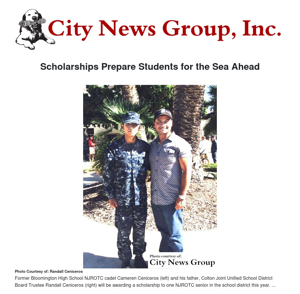 The Ceniceros family is continuing to financially assist CJUSD NJROTC seniors, after awarding two $500 cash scholarships last year. The family also has a stake in the school district's NJROTC program, with Ceniceros's son Cameren being a 2014 graduate of Bloomington High School and a former NJROTC student. Currently, Cameren attends the University of California, San Diego, where he participates in the NROTC program. He is a Navy midshipman and is studying computer engineering.