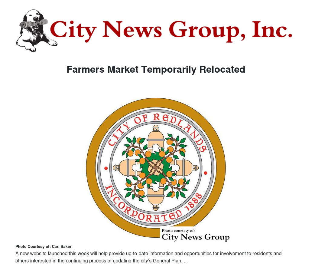 The year-round market will temporarily relocate to the northwest corner of the Redlands Mall parking lot Saturday, Jan. 24, in order to accommodate next week’s repaving of the Ed Hales Park parking lot between Fifth and Sixth streets, as part of a continuing effort to enhance public facilities and revitalization of Historic Downtown Redlands. The repaving is expected to take one week.