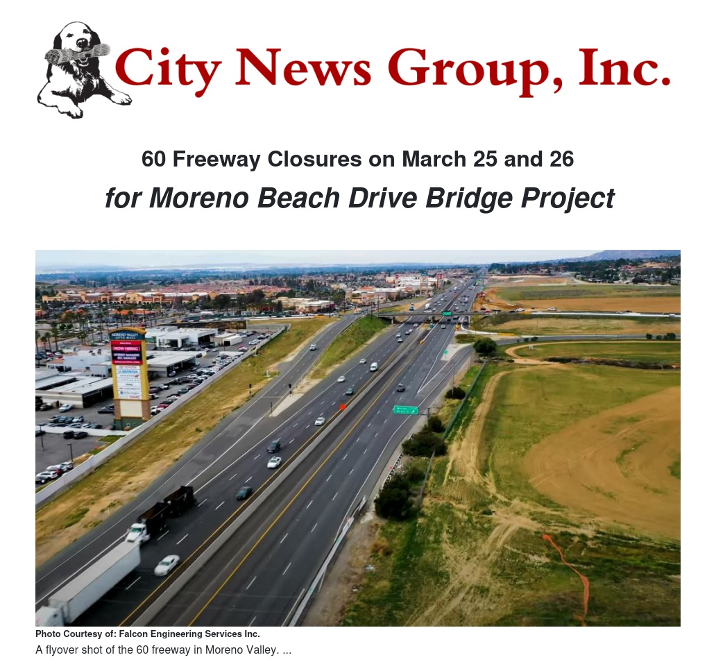 As part of the ongoing Moreno Beach Drive bridge project, portions of the 60 freeway are scheduled to be closed during the nights of Friday, March 25, and Saturday, March 26.