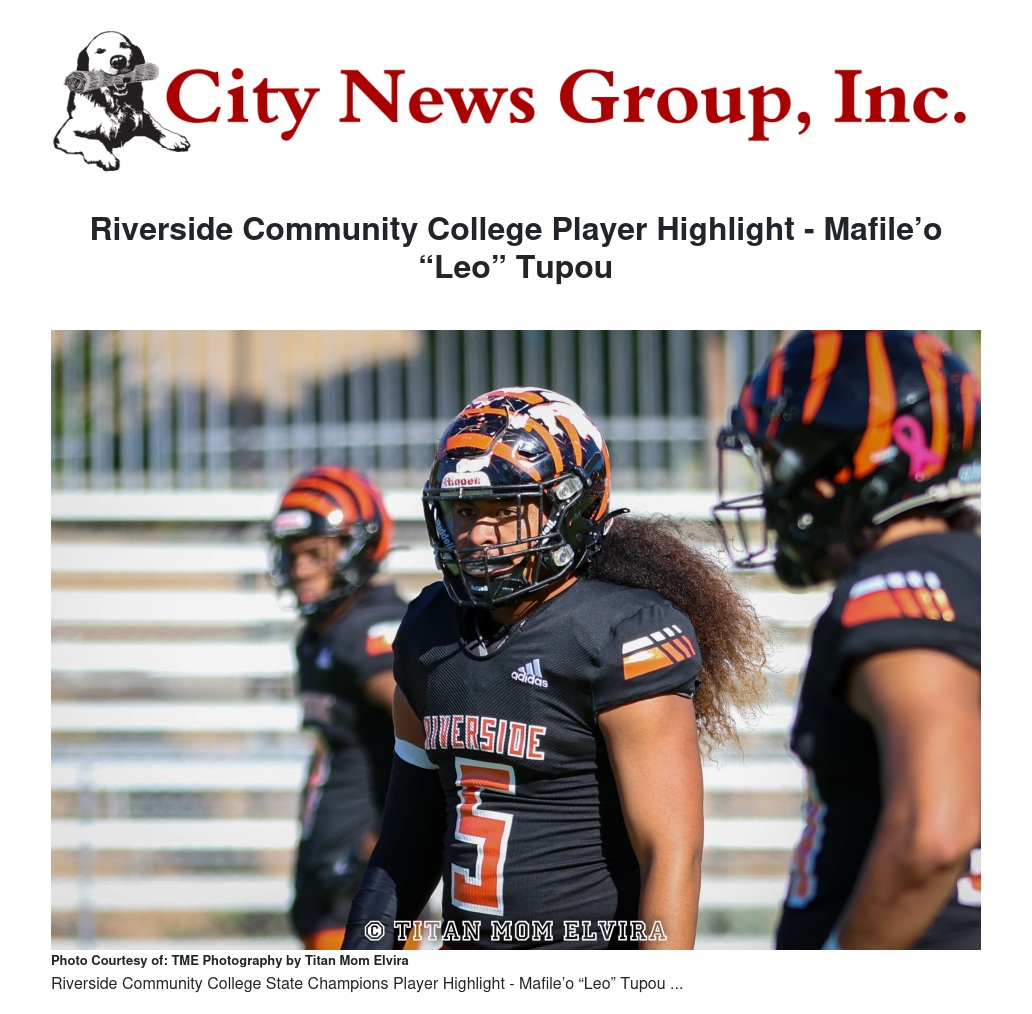 Riverside Community College Player Highlight - Mafile’o “Leo” Tupou by Titan Mom Elvira & Francisco Valenzuela Jr. - City News Group, Inc.