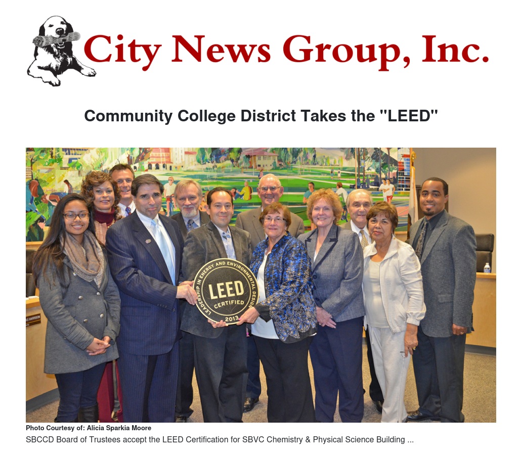 SBVC Chancellor Bruce Baron noted, “This LEED certification for the Chemistry and Physical Sciences building at San Bernardino Valley College was made possible by the support of the community through the Measure M and P bonds. They allowed us to maximize our resources in designing a sustainable learning environment for our students and employees.”