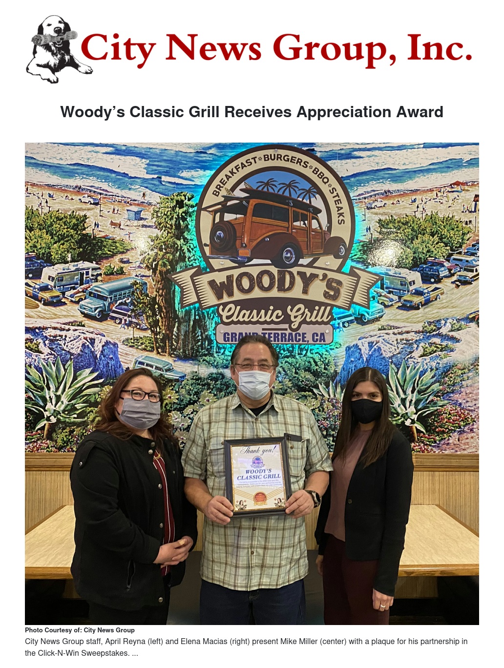 Woody’s Classic Grill Receives Appreciation Award by Elena Macias - City News Group, Inc.