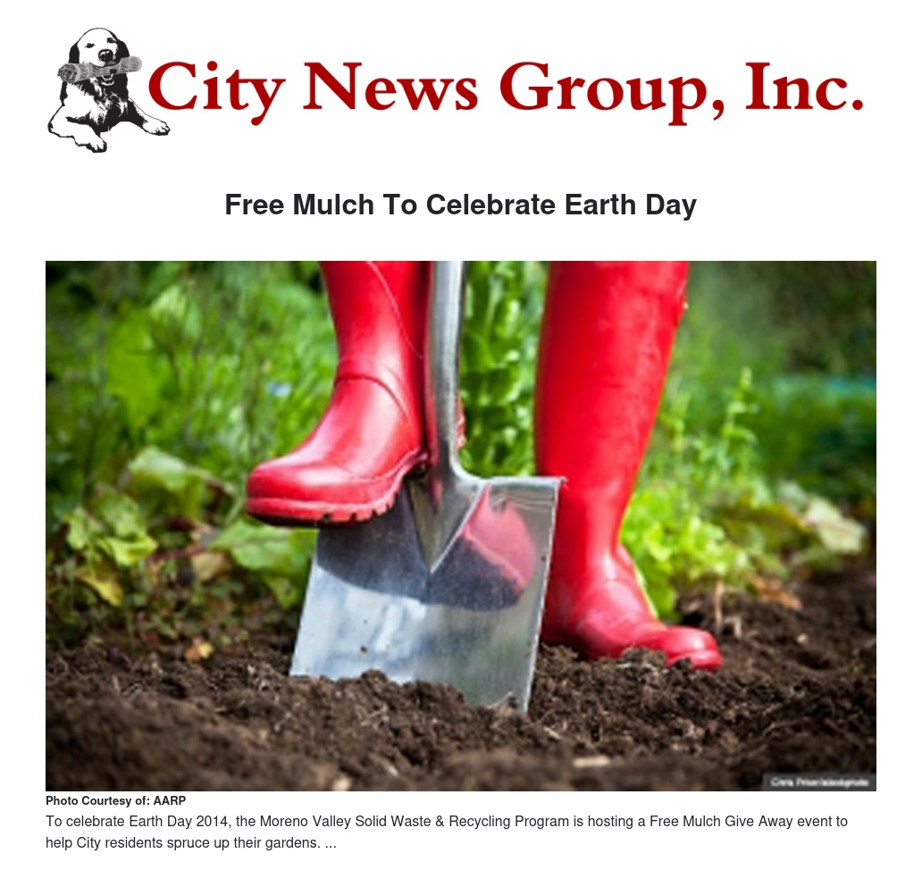 To celebrate Earth Day 2014, the Moreno Valley Solid Waste & Recycling Program is hosting a Free Mulch Give Away event to help residents spruce up their gardens. The event is Saturday, April 19th from 9 a.m. to 12 p.m. at the City Corporate Yard located at 15670 Perris Boulevard (between John F. Kennedy Drive and Iris Avenue).