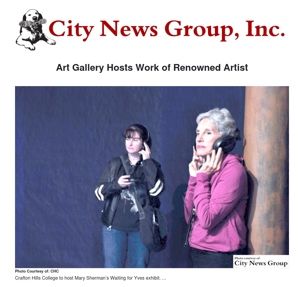 Sherman's Waiting for Yves exhibit will be hosted at the Crafton Hills College Art Gallery from Feb. 17 through March 12. Described by the Boston Pheonix as "shoving the definition of traditional painting into the 3D and kinetic realm, with work that swings, slides and otherwise responds to viewers," Sherman's works have been shown both locally and internationally, including at Shanghai’s Zendi MOMA, Taipei’s Kuandu Museum of Fine Arts, Chicago’s Peace Museum, New York City’s Trans Hudson Gallery, Seoul’s Kwanhoon Gallery and Vienna’s WUK Kunsthalle.