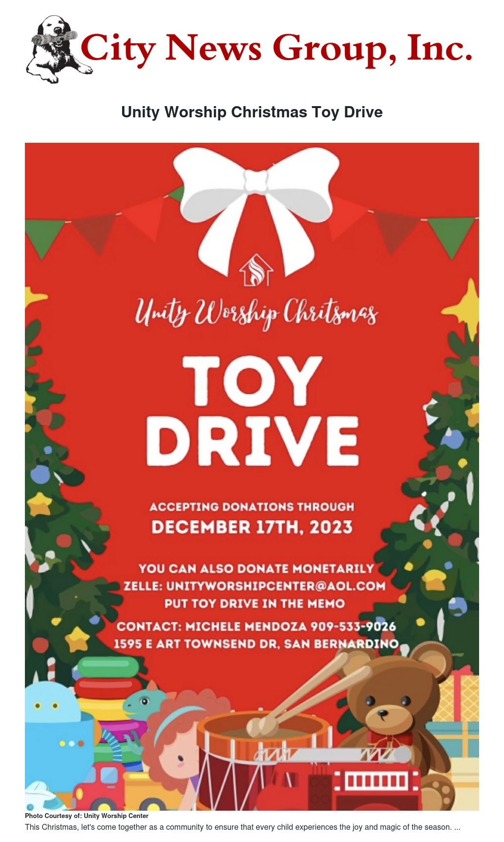 Unity Worship Center is Spreading Joy this Christmas Season by hosting their annual Christmas Toy Drive. As the festive season approaches, our hearts are filled with love, kindness, and a deep desire to make a positive impact in our communities. This Christmas, we at Unity Worship Center are excited to spread the holiday joy and bring smiles to children's faces through our annual Toy Drive. Leader and Pastor, Tim Arroyo has been wholeheartedly committed to ensuring that every child in our community experiences the magic and joy of Christmas regardless of their circumstances. Last year Unity Worship Center was able to serve over 50 unprivileged families, this year we are determined to expand our reach and connect with more families in need. Unity Worship Center is reaching out to our wonderful community to join forces and make a difference in the lives of children. If you are interested in donating and contributing to our Toy Drive or for more information on attending, please contact Michelle Mendoza / Event Coordinator at: (909)533-9026.