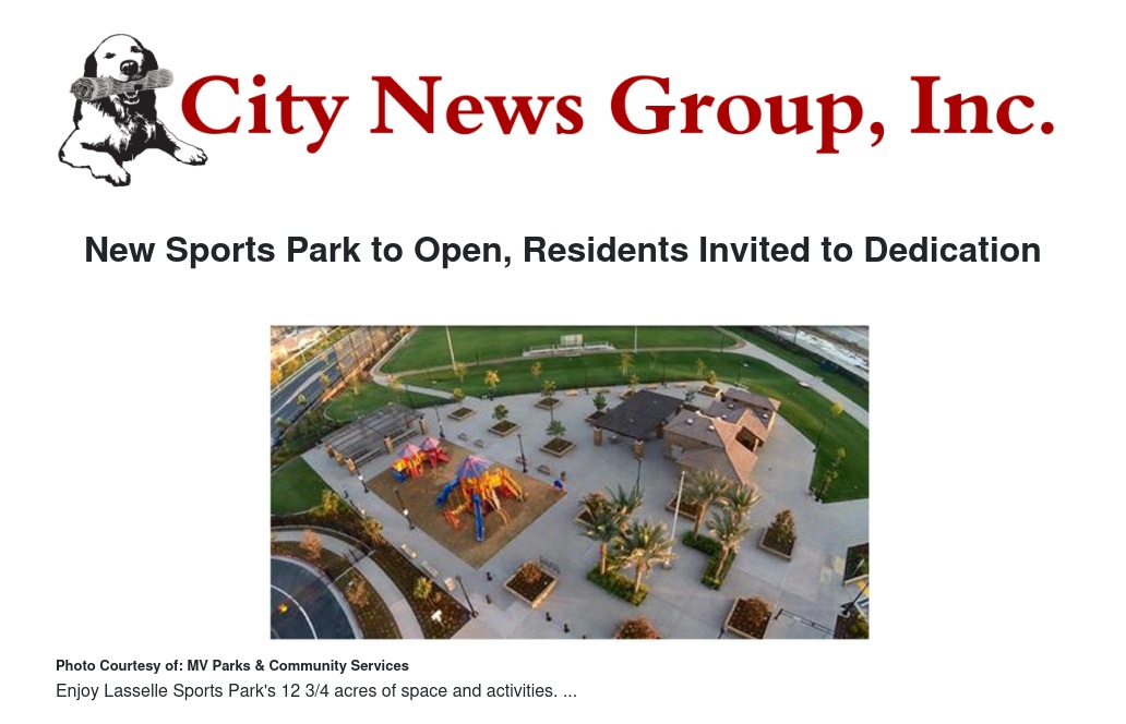 The City's Parks & Community Services Department is proudly hosting a grand opening dedication for Lasselle Sports Park on Saturday, Sept. 27 at 10 a.m.