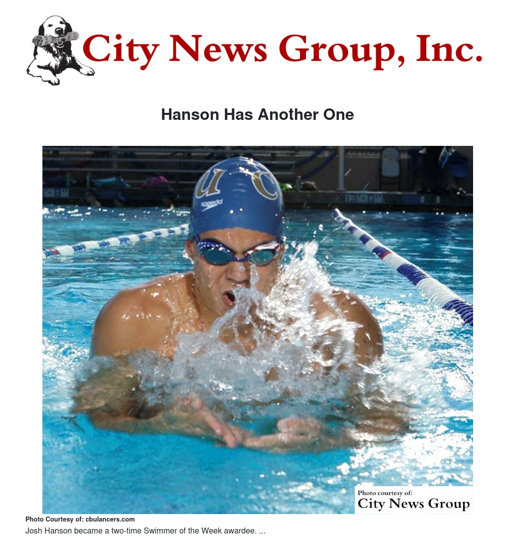 The Lancers defeated the Sagehens in their first dual of the season, 191-100, thanks in part to Hanson winning all four events he swam. He opened by helping CBU's 400-yard medley relay team set a new pool record with a win in three minutes, 28.76 seconds. Individually, Hanson would go on to win the 100 back (51.45), 200 fly (1:54.50) and 400 individual medley (4:04.07).
