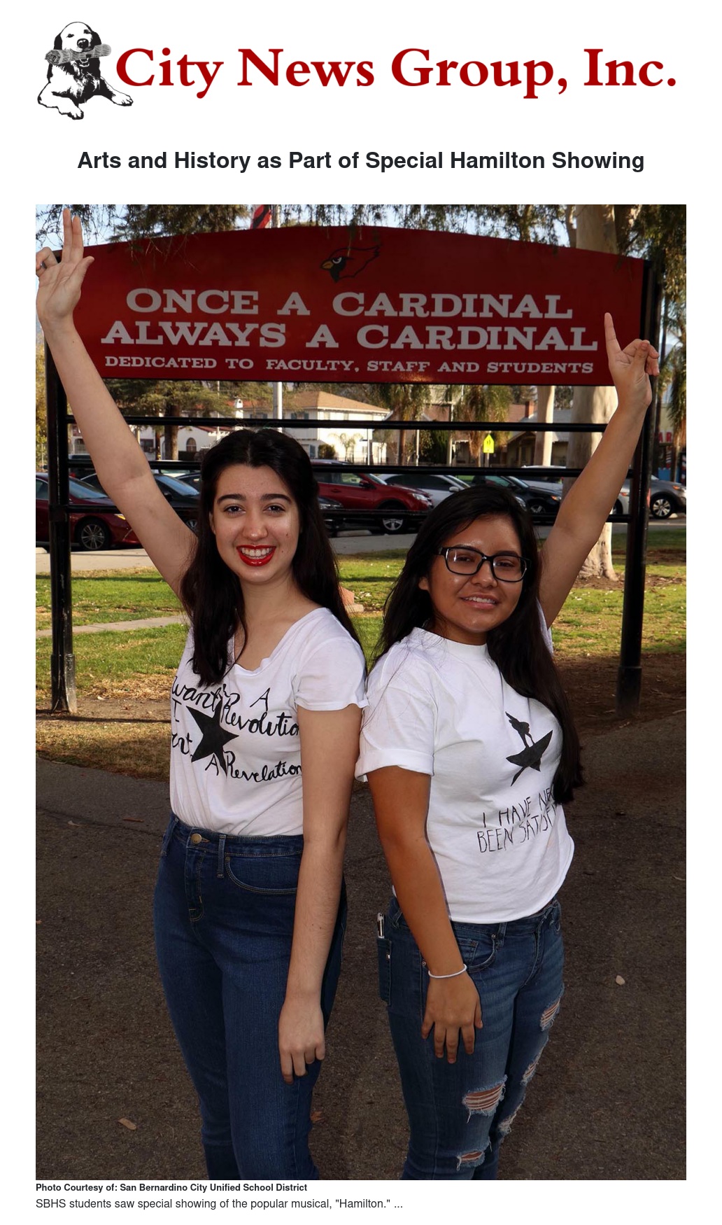 Two San Bernardino High School students were selected for that honor when the SBCUSD students attended Hamilton. Lorena Hernandez and Natalie Valdez performed for 2,800 students.