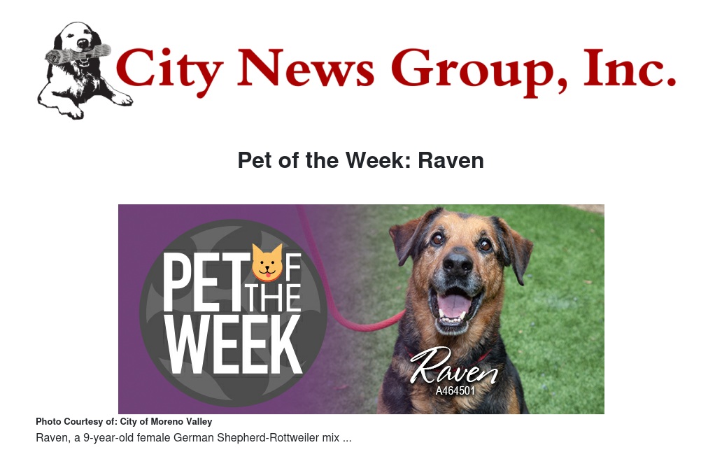If you would like to make Raven or any pet from the Moreno Valley Animal Shelter part of your family, please contact the Moreno Valley Animal Shelter at 951.413.3790 or visit www.moval.org/pets.