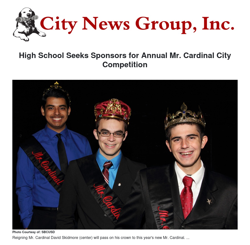 Mr. Cardinal City 2013-2014 sponsors included Stater Bros. Markets, Trophy House, San Bernardino High Class of 1952, The Sun newspaper, Toyota of San Bernardino, D’Arca Formal Wear, Angel’s Closets, San Bernardino City Unified School District, Virginia Marquez, Mr. and Mrs. Robert Hickey, Mr. and Mrs. Daniel Arellano, Miss Corina Borsuk, and San Bernardino High School Associated Student Body.