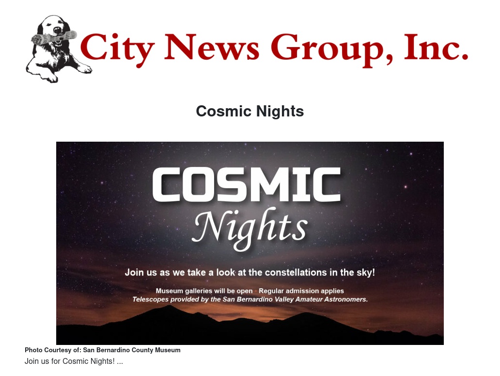 Join us Friday, March 15 2024 for Cosmic Nights! In partnership with, the San Bernardino Valley Amateur Astronomers (SBVAA). The event takes place at the San Bernardino County Museum 2024 Orange Tree Lane Redlands, CA 92374 outdoors, weather permitting, and guests are advised to wear comfortable clothing and shoes. Museum galleries will be open during the event. General admission is $10 (adult), $8 (military or senior), $7 (student), and $5 (child ages 6 to 12). Children five and under are free. Museum Association members receive a 50% discount on admission. Parking is free. The museum is accessible to persons with disabilities. The partnership helps SBVAA, founded in 1958, achieve their goal of introducing the community to astronomy, to organize amateur astronomers in the San Bernardino Valley area, and to increase knowledge and excitement in astronomy.