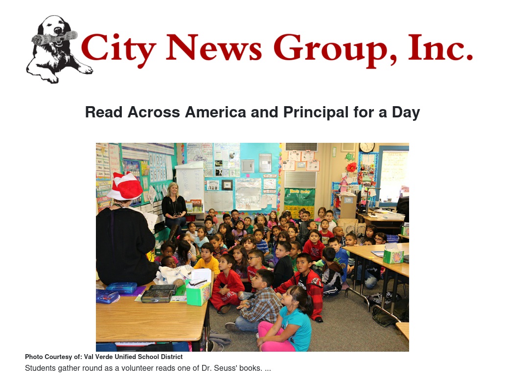 Volunteers from various sectors of business, government, entertainment and philanthropy read a Dr. Seuss book to classes throughout the Val Verde Unified School District (VVUSD). Board of Education members, business partners, and volunteers worked together to help make this event a huge success; one star guest was Grammy Award winning artist Lupillo Rivera who read to students at Columbia Elementary School.
