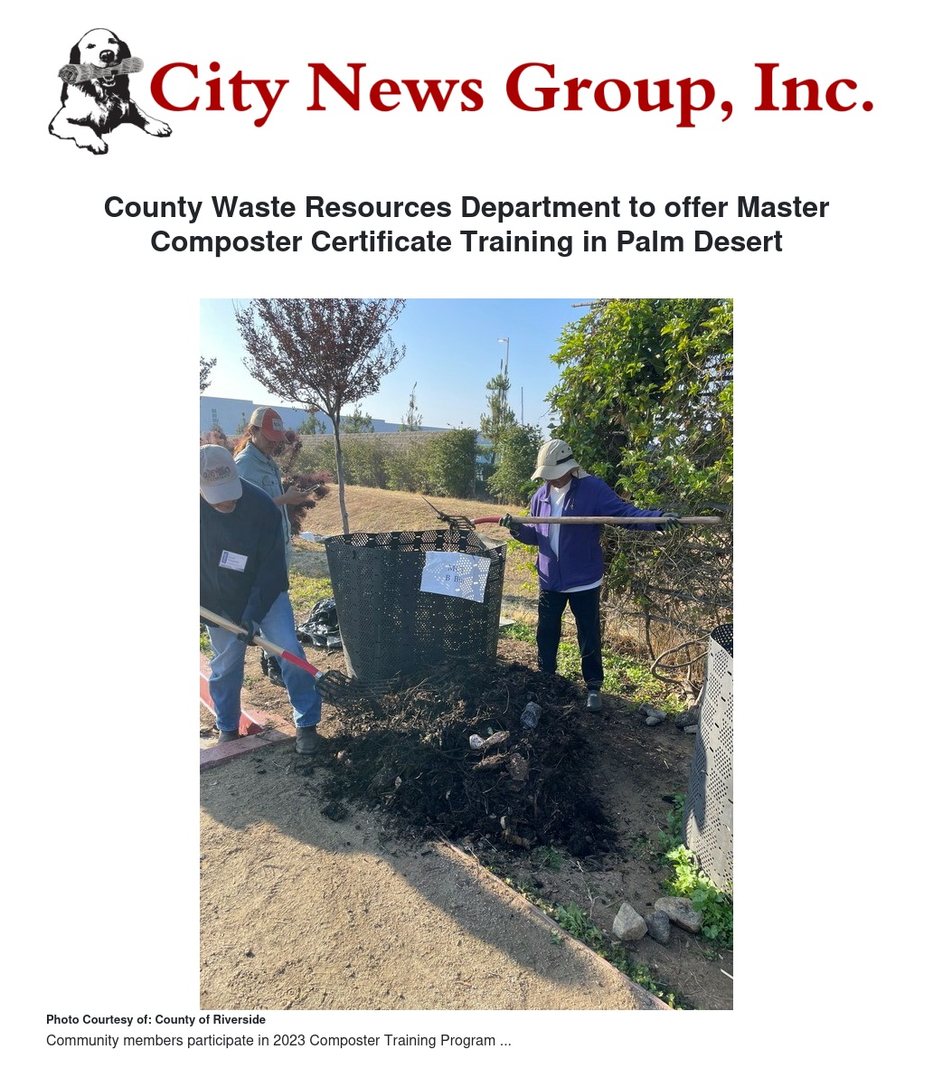 The Riverside County Department of Waste Resources has offered Backyard Composting classes and workshops for 30 years to provide residents with the basic knowledge on how to compost household organic waste, safely and efficiently. In addition to these basic composting classes, the department will be offering a free Master Composter Certificate Training program with a more advanced look at home composting and a variety of methods that can be used, more study of the composting process, and learning more about the waste stream in Riverside County.