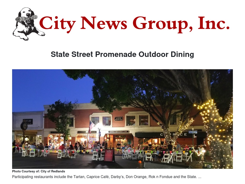 The City of Redlands worked with local downtown restaurants to resume outdoor dining in Historic Downtown Redlands beginning Feb. 11 on East State Street between Orange Street and Sixth Street, and Fifth Street, from Redlands Boulevard to Citrus Avenue, from 6:30 to 11 p.m. Thursday, Friday and Saturday evenings and on one block of East State Street between Orange and Fifth streets from 11 a.m. to 8 p.m. Sundays.