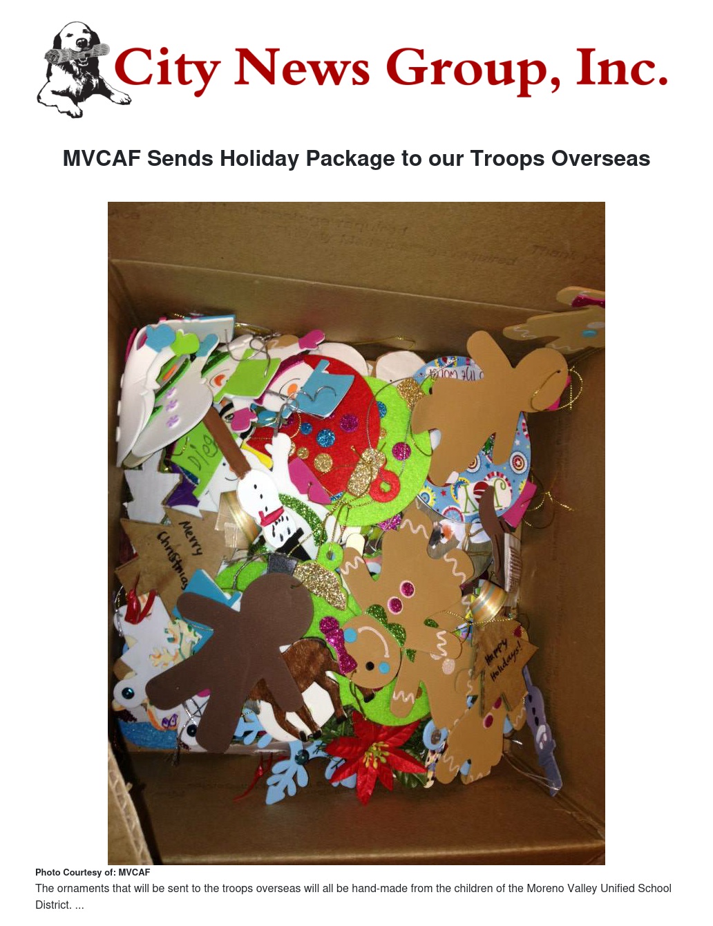 Last year, Richard L. F. Archer Sr., MVCAF President and CEO, was looking for a community-based project as a way to say “Thank You” to service men and women. Getting a late start, MVCAF had a decorating event at their Vanguard Community Art Gallery, located at the Moreno Valley Mall, and also worked with a Girl Scout troop. Within a couple of weeks, the groups had made 150 hand-made ornaments, along with a few Christmas cards. Everything was shipped to Idaho, then to Germany, and then on to the various outposts.