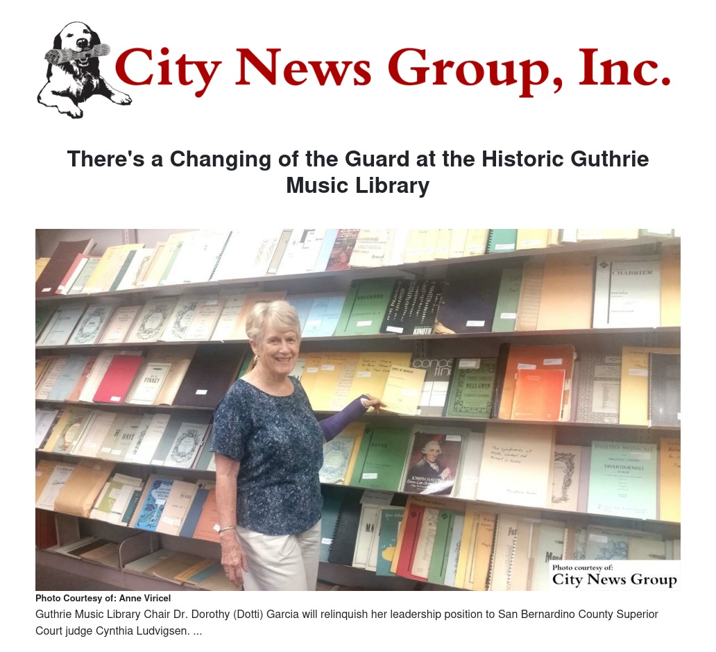 July 1 marked a rather historic changing of the guard as longtime Guthrie Music Library Chair Dr. Dorothy (Dotti) Garcia will relinquish her leadership position to San Bernardino County Superior Court judge Cynthia Ludvigsen.