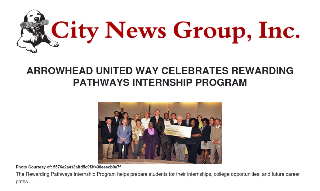 San Bernardino, CA ------ Arrowhead United Way’s Rewarding Pathways Internship Program was proud to host its Awards Ceremony recently. This special event honored the high school junior and senior participants for their entrepreneur group projects, participation, communication skills and completion of the program. We were honored to present eight high school seniors with scholarship awards that ranged from $500 to $1500 who provided essays with great quality and content. Twenty-eight students were honored with gift cards to In-n-Out for excellent demonstrations of communication skills, 16 students received gift cards to Target for participation, and $50 gift cards were given to 16 students for perfect attendance. The top three entrepreneur groups that consisted of 6 students each were individually gifted with $100 for first place, $75 for second place and $50 for third. The students invited their friends and families to enjoy an evening of fun and celebration.